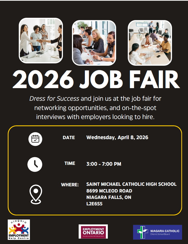 Home » Events » 2026 JOB FAIR 2026 JOB FAIR When: April 8, 2026 3:00 pm - April 8, 2026 7:00 pm Where: Saint Michael Catholic High School - 8699 Mcleod Road, Niagara Falls, ON L2E 6S5 Save the date for our 2026 Job Fair in partnership with the Niagara Catholic District School Board