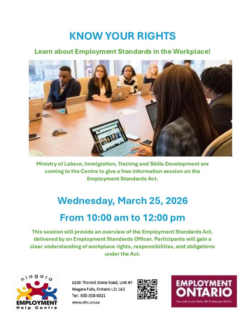 Ministry of Labour, Immigration, Training and Skills Development are coming to the Centre to give a free information session on the Employment Standards Act.